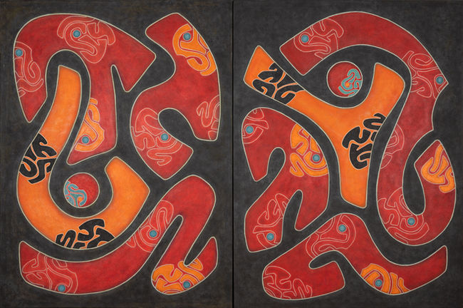 The Primordial Floating Shapes technique developed by Alexandra Diez is superbly showcased in the Multi-Panel Series as the shapes span rhythmically across the panels.